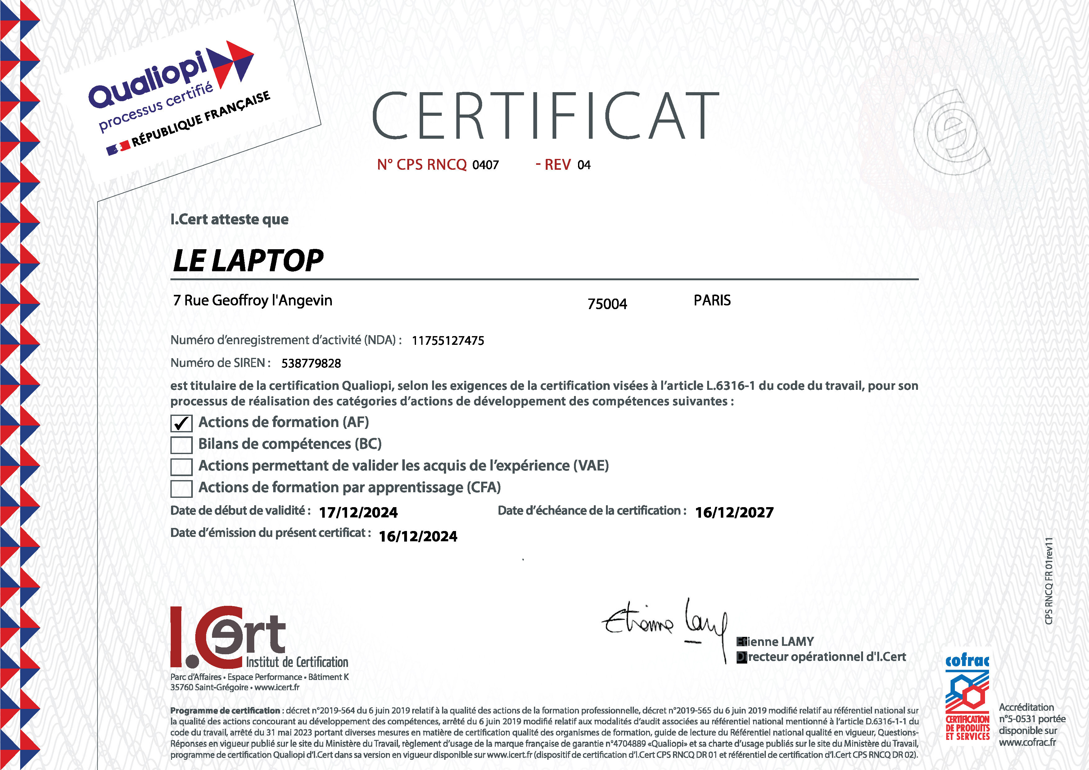 La certification qualité Qualiopi a été délivrée au titre de la catégorie : Actions de formations, à l’organisme de formation Le Laptop, depuis 2020.
